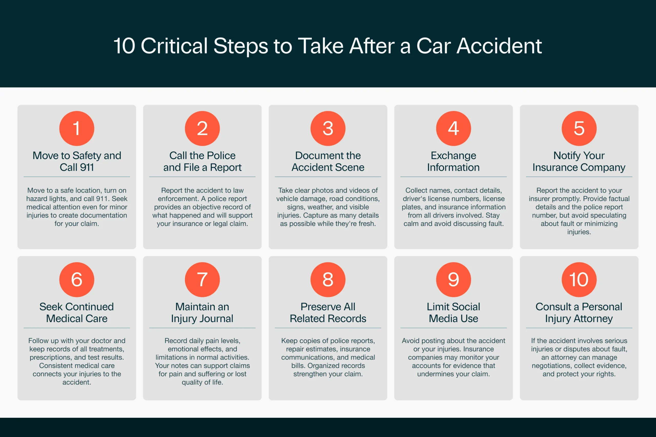 Car accidents are overwhelming, but knowing what to do in those critical first moments can protect your health, finances, and legal rights. Start by ensuring safety, contacting law enforcement, and seeking medical care. From there, document the scene, exchange information, notify your insurer, and carefully preserve all records. Avoid risky social media posts and consider consulting an attorney if the accident involves serious injuries or complex disputes.
